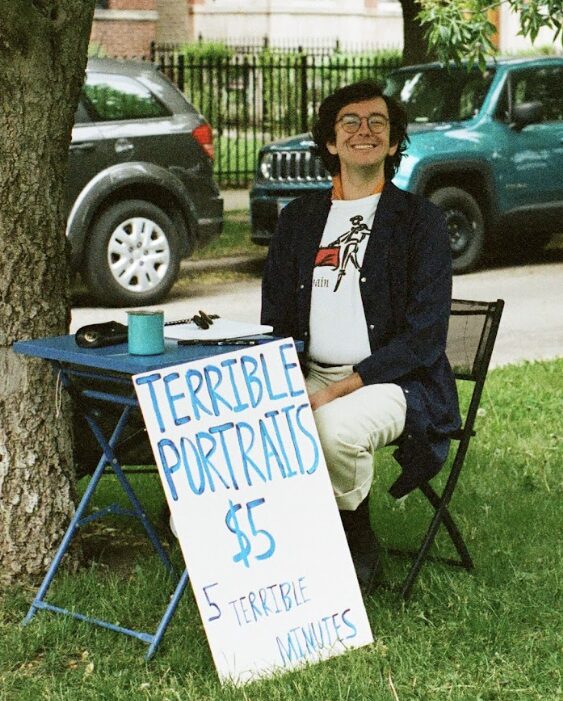 Terrible Portraits is the one man art stand of Chicago based performance artist Jacob Ryan Reno. The portraits are terrible. They are drawn in 5 terrible minutes. He has no intention of getting better. In the age of AI Generated art, Reno’s work as Terrible Portraits hopes to inspire community engagement and in-person connection.
